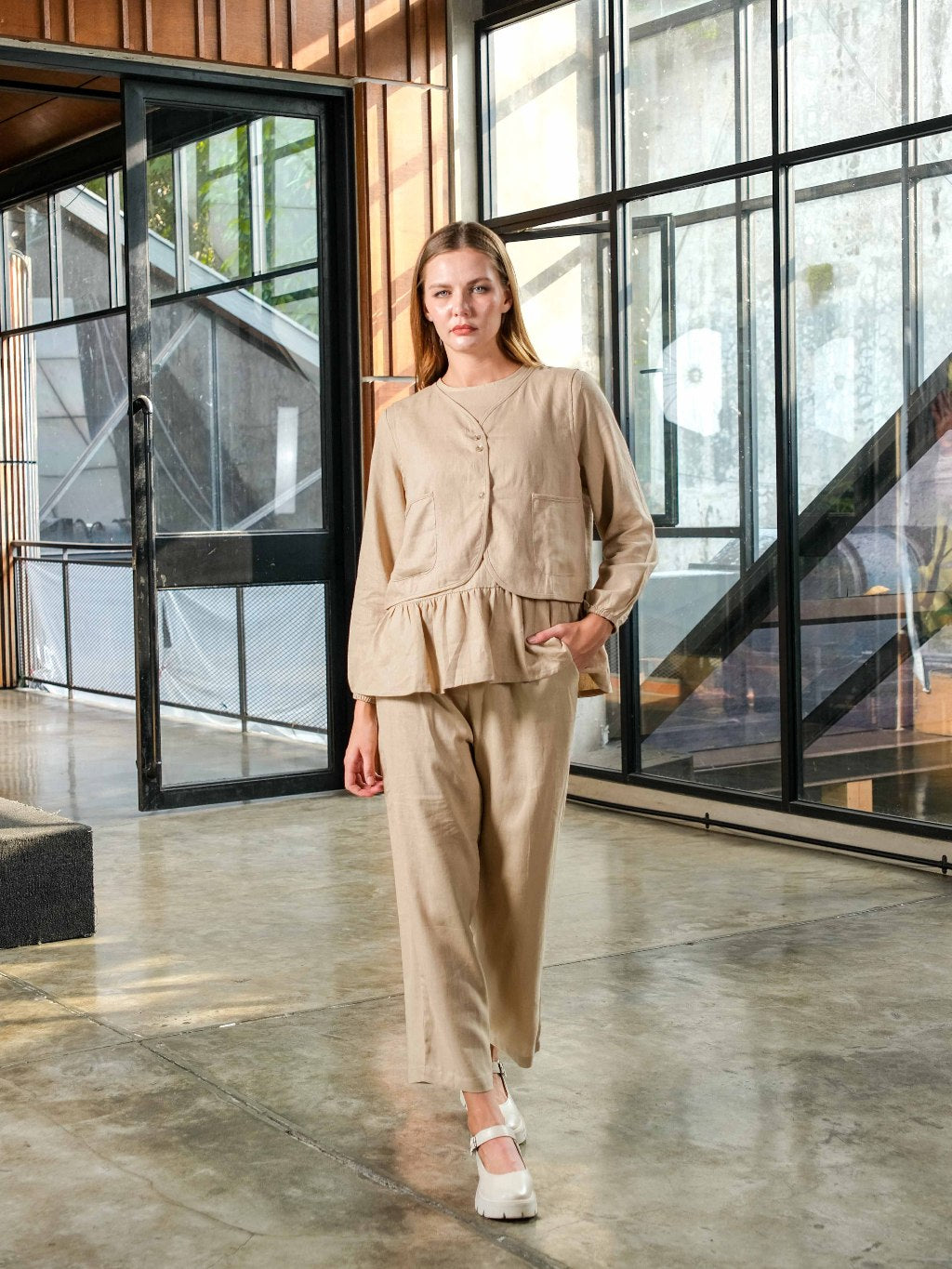 One Set Linen Pakaian Set Wanita Tanpa Lengan